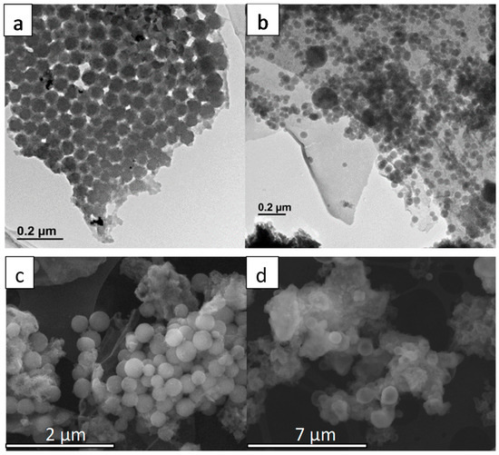 (a,b) TEM and (c,d) scanning electron microscopy (SEM) images of ZnO/PAA5 synthetized at 0 °C (a,c) and 40 °C (b,d).