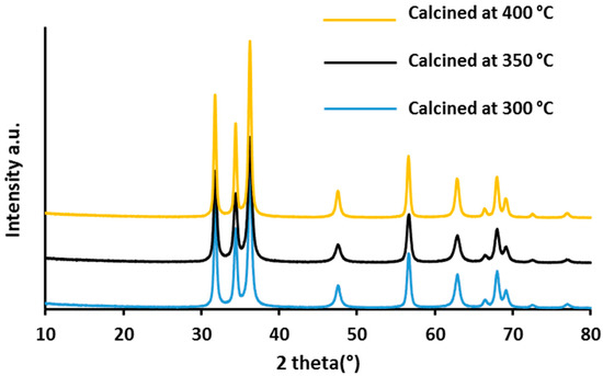 Compared to the as-prepared ZnO/PAA2 sample, the BET surface area increased with the increase in calcination temperature, from 20 m2·g−1 to 51 m2·g−1 after calcination at 350 °C. At 400 °C, the specific surface area decreased drastically, indicating that ZnO nanoparticles started sintering, in agreement with the TEM images.
