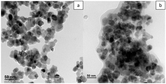 By comparing TEM images obtained for samples synthesized at 0 °C (Figure 3a) and 40 °C (Figure 3b), the decrease in specific surface area could result from the lower amount of 2D nano-structures and the fusion of some mesospheres into larger aggregates. At low temperatures, it was also possible to find hollow mesospheres, but in very limited numbers.