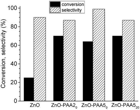 Finally, the calcinations of ZnO/PAA220 and ZnO/PAA520 supports before copper deposition did not bring any benefit on the performance of the final catalysts in terms of conversion and selectivity (Entries 12–13, Table 8).