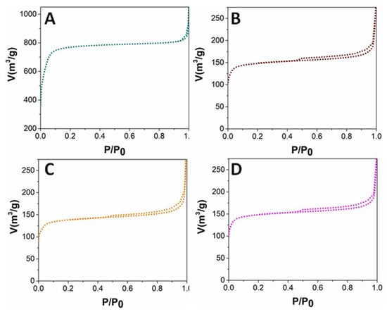 N2 adsorption–desorption measurements of all samples were performed to obtain insights into their textural properties. N2 physisorption analysis of UiO-66 displayed certain microporosity, as suggested from the obtained isotherm (type 1), showing a sharp increase at P/P0 < 0.1 (Figure 1A). UiO-66 sample exhibited an outstanding surface area of 1399 m2·g−1. Mechanochemical incorporation of nickel entities considerably affects the textural properties of the samples. As can be observed in Figure 1B–D, N2 adsorption–desorption isotherms were shown to be type IV, which is typical of mesoporous materials. The observed modification could be ascribed to the collapse of UiO-66 architecture due to the mechanochemical treatment, while Ni content seems not to have a critical influence on the surface area of the samples, displaying values of 496, 465 and 444 m2·g−1 for 1%Ni/UiO-66, 3%Ni/UiO-66 and 5%Ni/UiO-66, respectively.