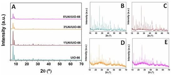 XRD patterns of the synthesized materials. (A) XRD diffractograms of all samples from 5° to 70°. Magnified XRD patterns from 10° to 70° for (B) UiO-66, (C) 1%Ni/UiO-66, (D) 3%Ni/UiO-66, (E) 5%Ni/ UiO-66.