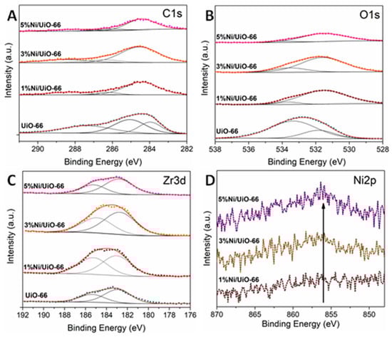 In order to study the electronic properties of the samples and to corroborate the incorporation of Ni entities on the UiO-66 surface, XPS analysis was carried out (Figure 3). XPS results revealed the presence of carbon, oxygen, zirconium and nickel, as suggested from the acquired regions. In particular, the C1s and O1s XPS regions exhibited certain modifications after the mechanochemical incorporation of Ni. The C1s region of the UiO-66 sample displayed the presence of three main contributions around 284.0, 285.1 and 287.9 eV, related to C−C/C=C, C=O and COO, respectively (Figure 3A). Samples modified with Ni showed lower contributions of C=O and COO− signals, most likely due to interactions between the oxygen groups and the Ni entities during the mechanochemical treatment []. Similar behavior was observed in the O1s region after Ni incorporation (Figure 3B). The O1s XPS region of UiO-66 material displayed the presence of two main signals located at 531.9 and 533.5 eV, attributed to O-Zr and Zr-O-C bonds []. The observed increase in the peak at around 531.0 eV could be most likely attributed to the appearance and overlapping of a new signal related to the Ni-O bond, which has been reported in the literature to be around 529.9 eV for Ni2+ species []. Furthermore, the Zr 3d XPS region of the four samples was acquired, as can be observed in Figure 3C. In all cases, Zr 3d5/2 peaks were located at ca. 182.4 eV, while the distance between Zr 3d5/2 y Zr 3d3/2 bands were shown to be ca. 2.5 eV, indicating the formation of Zr (IV) species []. Additionally, Ni XPS region was acquired for the three Ni modified samples. Due to the low percentage of Ni in the samples, Ni2p XPS signal was practically undetectable for 1%Ni/UiO-66, but, in any case, a clear increase in the band intensity could be observed for higher Ni content. Such a band seems to be located over 855.0 eV, which is related to Ni2+ species and demonstrated the successful incorporation of Ni entities on the UiO-66 surface [,]. Furthermore, a sample containing 10% of nickel has been prepared and characterized by XPS, as shown in Figure S1, where Ni2p XPS signal could be clearly visualized, displaying a higher intensity in accordance with the higher nickel content.
