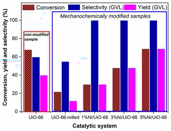 Mechanochemical modification of UiO-66 with nickel oxide nanoparticles was herein investigated. Besides its inherent advantages related to its simplicity, versatility, reproducibility and sustainable character, mechanochemical processes were shown to be effective for the incorporation of metal oxide entities on the surface of the aforementioned metal–organic framework, as confirmed by XPS analysis. However, the mechanochemical strategy also resulted in a 65% decrease in the initial surface area. Such behavior was expected according to previous investigations on the effect of mechanochemical approaches on the textural properties of materials. In any case, the samples retained a feasible surface area, over 400 m2/g, and, more importantly, the nickel modified samples exhibited a greatly improved selectivity towards GVL—higher than 99%—and a maximum conversion value of 69%.