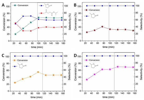 Catalytic performance in terms of stability, along run times of 180 min for (A) UiO-66, (B) 1%Ni/UiO-66, (C) 3%Ni/UiO-66, (D) 5%Ni/UiO-66.