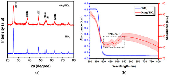 (a) XRD spectra, and (b) ultraviolet–visible (UV–vis) Absorption of the N/Ag/TiO2 Compared to that of the bare-TiO2.