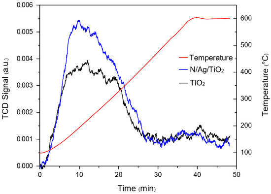 NH3-TPD characterization of the synthesized bare-TiO2 and N/Ag/TiO2 photocatalysts.