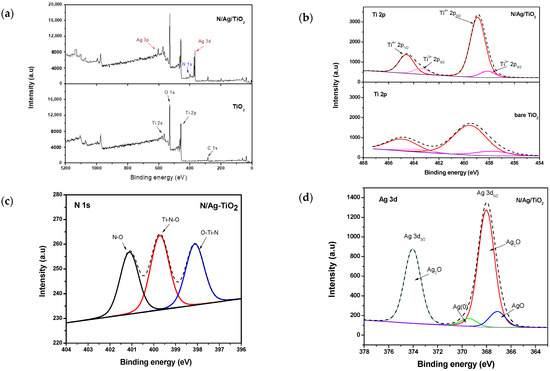 (a) Full X-ray photoelectron spectroscopy (XPS) spectra of N/Ag/TiO2 and bare-TiO2 photocatalysts and high-resolution spectra of (b) Ti 2p, (c) N 1s, and (d) Ag 3d.