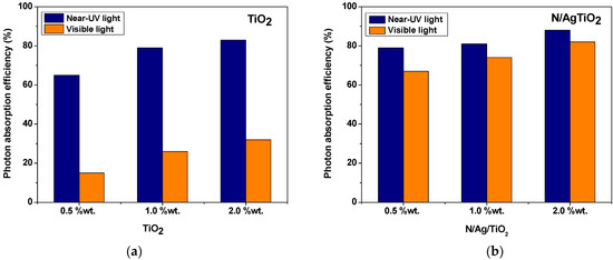 Near-UV light and visible light radiation photon absorption efficiencies on: (a) bare-TiO2, and (b) N/Ag/TiO2. Both bare-TiO2 and N/Ag/TiO2 are coated on the cylindrical stainless-steel woven mesh at different particle loadings (0.5–2 wt.%).