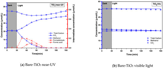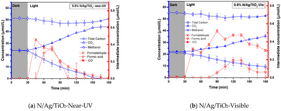 Figure 6a,b report the photocatalytic conversions of methanol under near-UV and visible light, using the N/Ag/TiO2 photocatalyst, which displays good photodegradation in both cases. Figure 6a,b also show that both formaldehyde and formic acid are two produced intermediate species in both cases, while concentrations are reduced with irradiation time. Note 2: One should note that close to 100% total carbon, calculated as a summation of all carbon-containing species at any time during the run, shows the reliable accounting of all chemical species.