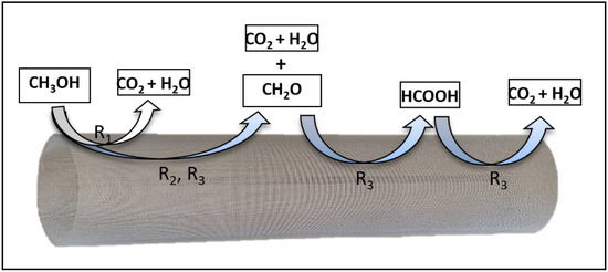 This series-parallel network accounts for the following steps: (i) a first reaction step (R1), with methanol oxidizing to CO2 directly, without any detectable reaction intermediates, (ii) a second reaction step (R2) with methanol oxidizing to CO2, yielding formaldehyde (CH2O) as a detectable intermediate, and decomposing later into CO2, and (iii) a third reaction step (R3), accounting for methanol oxidizing to CO2, with formaldehyde (CH2O) and formic acid (HCOOH) as intermediate species.