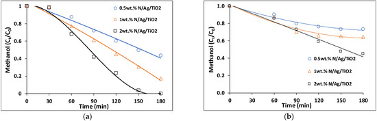 Figure 10a,b also display a maximum photocatalytic rate using 25 µmol/L of methanol, with 2 wt.% N/Ag/TiO2 coated on a mesh, with this being consistent for near-UV and visible light.