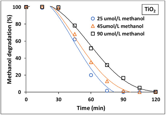 Photocatalytic performance of methanol degradation at different initial concentrations of methanol (25, 45 and 90 µmol/L) with 2 wt.% Bare-TiO2 coated on a mesh under near-UV Light. Note: Reported data are for at least three repeats with 8 ± 1% SD.