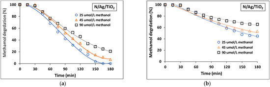Photocatalytic performance of methanol degradation at three different initial concentrations of methanol (25, 45 and 90 µmol/L) with 2 wt.% N/Ag/TiO2 coated on a mesh under (a) near-UV light and (b) visible light. Note: Reported data are for at least three repeats with 10 ± 2% SD.