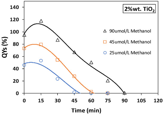 Figure 11 reports QYs% for the bare-TiO2 under near-UV light irradiation, showing a QY% increasing, with a maximum value after 15 min of irradiation. Then, the QYs% steadily decrease until reaching zero, at the longer irradiation times. It is relevant to observe that at 90 µmol/L, the QYs% surpass 100%, with this being consistent with results from Lugo Vega et al. [57] who used a Degussa P25 (TiO2) photocatalyst in the Photo-CREC-Air, under near-UV light, for acetone photodegradation.