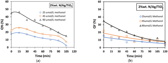 The quantum yield (QY) is a parameter that can be utilized to express the efficiency of the photocatalytic process (de Lasa et al. [19]). The QY can be calculated based on hydroxyl radical formation rates over the photocatalyst photon absorption rates. Figure 11 and Figure 12 display the percentual quantum yields (QYs%), for 2 wt.% of bare-TiO2 and N/Ag/TiO2 coated on the mesh, as a function of irradiation reaction time for the photodegradation of methanol at 25, 45 and 90 µmol/L concentrations. An example of a QY% calculation is described in Appendix C.