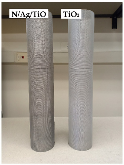 Both the bare-TiO2 and the N/Ag/TiO2 photocatalysts, were prepared via the solvothermal method. The prepared photocatalysts were immobilized on a cylinder of stainless-steel woven wire mesh using the spray coating method. This method is proposed here as an appropriate technique for coating a substrate material with a cylindrical shape. To optimize the immobilized photocatalyst loadings (0.5–2 wt.%), different amounts of photocatalyst were coated on a woven stainless-steel mesh.