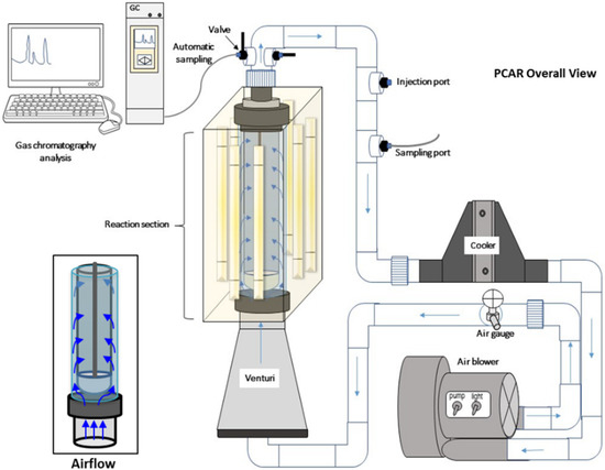 A calibration was performed in the PCAR to quantify the relative humidity (RH) of air streams. The RH is an important parameter to be considered to determine whether the water vapor in the PCAR has an effect on the photocatalytic activity. The RH data were taken with a hygrometer (Mengshen digital humidity meter) at different known water concentrations. The hygrometer operates from 0 to 100% RH and −20 to 80 °C range, respectively. Furthermore, its humidity accuracy is ±3% RH and the resolution falls into 0.01% RH or 0.01 °C.