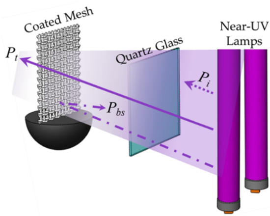 Calculated photon fluxes of incident light (Pi, r = 5.9 cm), transmitted light (Pt, 5.25 cm) and backscattered light (Pbs, r = 7.7) by the coated mesh. All occur when using the woven mesh coated with 2 wt.% of photocatalyst loading under either near-UV (320–380 nm wavelength) or visible light (380–700 nm wavelength).