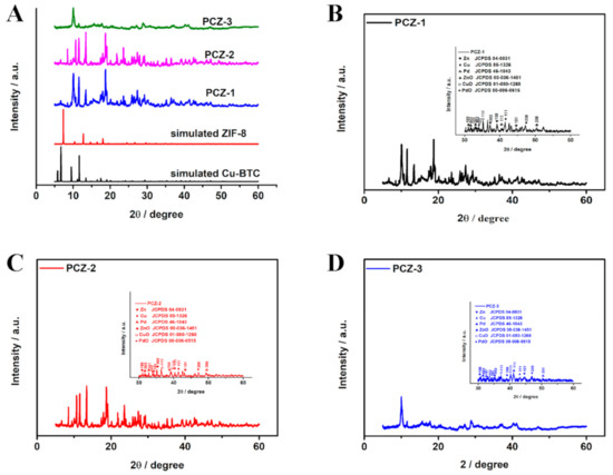 Figure 3. (A) XRD patterns of PCZs and simulated XRD patterns of ZIF-8 and Cu-BTC. XRD and PXRD (inset) patterns of PCZs (BD).