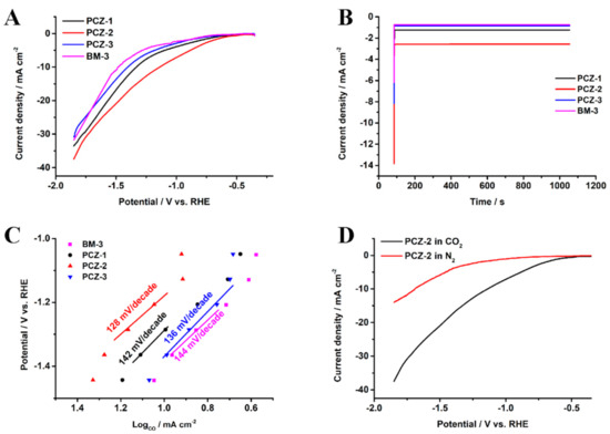 Figure 5. (A) LSV curves and (B) chronoamperometry PCZs and BM-3 at −0.75 V vs. RHE. (C) Tafel plots with a linear fit of PCZs and BM-3 catalysts. (D) LSV curves of PCZ-2 in N2 and CO2. We used 0.1 M KHCO3 aqueous solution as an electrolyte for all experiments.