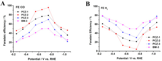 Figure 6. The faradaic efficiency (FE) for (A) CO and (B) H2 of the PCZs and BM-3 catalysts at various potentials.
