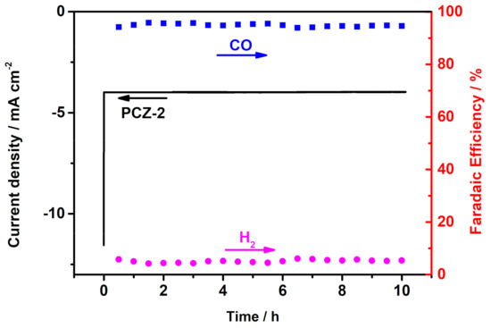 The stability of the PCZ-2 catalyst was evaluated by a 10-h chronoamperometry test conducted at a constant potential (−0.75 V vs. RHE). As shown Figure 7, both the current density and FE of CO were almost constant even after 10 h ERC operation, which indicates the excellent stability of as-prepared PCZ-2 towards ERC.