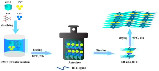 The PCZs were synthesized via a solvothermal process by the following the previous report [50] with some modifications, as shown in Scheme 1. In brief, ZIF-8 was synthesized following the procedure reported by Chen et al. with some modifications [51]. Typically, Cu(NO3)2, PdCl2, and BTC were dissolved into the 45 mL mixed solution of H2O/ethanol/N,N′-dimethylformamide (DMF) and stirred in the air for 15 min with magnetic bar, and the PCZs were obtained after reaction time. Then, the solution was transferred to Teflon-autoclave and was kept at 85 °C for 20 h. The final product was filtered and washed 3 times with methanol. Finally, it was dried at 90 °C 24 h in the vacuum oven. The samples were named as PCZ-n (n = 1–3) depending on the molar ratio of Pd/Cu/Zn. The molar ratios of PCZ-1, PCZ-2, and PCZ-3 were 0.25:0.75:1, 0.5:0.5:1, and 0.75:0.25:1, respectively. For the comparison, Cu and Zn bimetallic electrocatalysts (BM-3) were also synthesized by the same procedure with the 1:1 molar ratio of Zn to Cu.