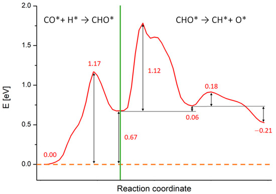 As shown in Figure 4, the process that requires more energy is the first dissociation of the C-O bond, with an activation energy barrier of about 1.12 eV to occur. These activation energy barriers are compatible with those of theoretical studies carried out on similar systems: in particular, Zhang et al. [29] estimated that CHO* dissociation can take place on Ru (100) with an activation barrier of about 1.48 eV, while Avanesian et al. [13] showed that on Rh (211), this step can occur with a free energy barrier of about 1.43 eV. At the same time, the computed barriers overestimate experimental values for the whole CO2 methanation reaction that range from 0.7 to 1.0 eV depending on the support [16,19,71,72,73]. The energy barrier overestimation with respect to experiments can be linked to contributions arising from the presence of co-adsorbed species. Indeed, the calculated energy profiles refer to the dissociation of an isolate CHO* species without accounting for the presence of other co-absorbed species. However, it was proved that after the first dissociative adsorption of CO2, the dissociated oxygen atoms remain absorbed on the surface and their presence reduces the activation barrier of the whole methanation reaction [19,66,73]. This explains at the same time why the methanation activation energy is lower for CO2 than that of CO of about 0.15 ÷ 0.35 eV, depending on the experimental conditions [16,19,21,73], and the overestimation of the reaction barrier presented in this work.