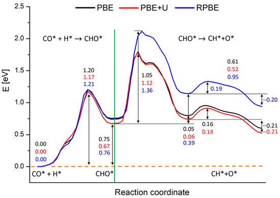 As already mentioned, the rate-determining step of the Rh catalyzed CO2 methanation reaction was identified in the CO* + H* → CH* + O* step through the formation of CHO* species [5,6,10,13,14]. Previous DFT simulations concerning the study of Ru (0001) catalyzed CO2 reduction, showed that the CHO* formation and its dissociation have comparable energy barriers [13,29]. A kinetic study performed on top of such calculations points to the CHO* dissociation as the rds of the whole reduction process [13]. To the best of our knowledge, no theoretical studies are currently available concerning the CO2 reduction over rhodium surfaces; what is known from the study of CH3OH dehydrogenation on Rh (111) is that the CHO* formation has an energy barrier similar to that found on the Ru (0001) surface [13,29,70]. Therefore, we calculated the energy landscape of the whole process generating the CH*/O* co-adsorbed pair from CO* and H* through CHO*, at the PBE, PBE+U and RPBE levels. We will discuss in the next paragraph the effect of the different functionals, while we focus here on the reaction mechanism itself, studied at the PBE+U level. The calculated energy profile is shown in Figure 3.