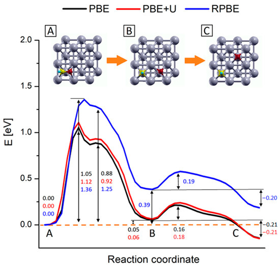 Finally, all the results presented here refer to systems in zero-absolute temperature conditions and do not include any entropic contribution. Indeed, previous studies concerning this reaction on similar systems showed entropic corrections to the free energy on the order of 0.1 eV at room temperature [13,28,29], smaller than the difference related to the use of various computational setups, as shown in the next section.