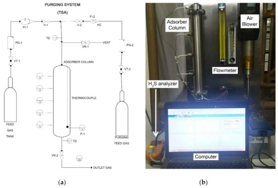 H2S adsorption system [32]: (a) schematic diagram and (b) experimental H2S adsorption test set-up.
