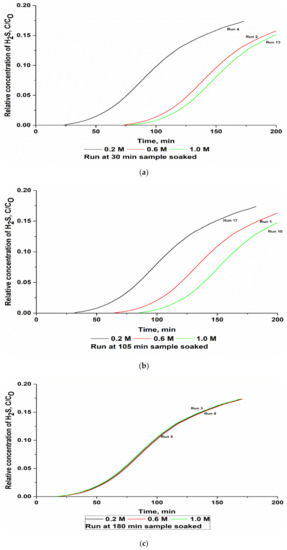 Breakthrough curve of H2S versus ZnAc2 molarity for a constant soaked time: (a) 30 min, (b) 105 min, and (c) 180 min.