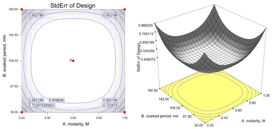 where the number of variables is k and the number of center points is CN. On the basis of Equation (3), the runs will be reduced to 17 with 3 major variables and 5 times the repetition in the center point to reduce the magnitude of error (k = 3 and CN = 5). Three conditions were investigated, namely the molarity state, soaked time, and the soaked temperature; hence, 17 runs were executed.
