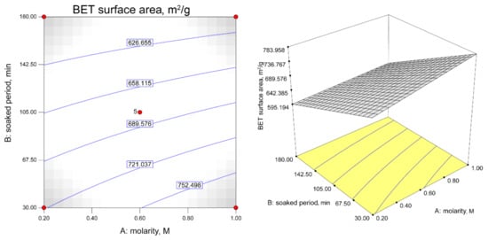 As shown in Figure 6, the constant soaked temperature shows the increments of the H2S adsorption capacity with an increase in the ZnAc2 molarity and the soaked period. The steepness of the increase in the H2S adsorption capacity ranged from 0.2 M to 1.0 M for the soaked period of 30 min to 180 min. Figure 6 shows the effect of the interaction of the factors with the constant soaked temperature on the BET surface area. The decreases in the molarity with the lowest soaked period resulted in the highest BET surface area of 721.04 m2/g, while at the lowest molarity (0.2 M) and a higher soaked period (>142.50 min), there was a reduction in the BET surface area.