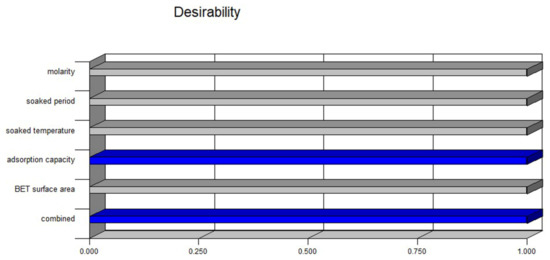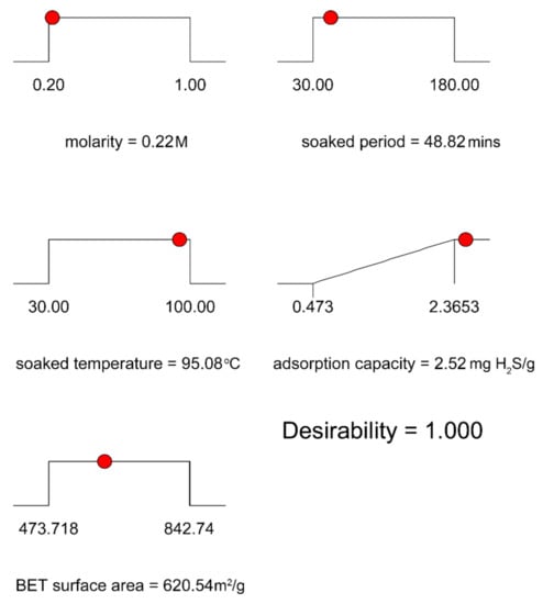 The key goal of the optimization process was to identify the variable values at which the adsorption capacity of the H2S and the BET surface area were optimal. Consequently, the Behnken configuration box was used to evaluate the best operating mode. Figure 8 displays the proposed model, showing that the highest adsorption capacity was 2.52 mg H2S/g and the BET surface area was 620.55 m2/g at the optimum molarity of 0.22 M, soaked time of 48.82 min, and soaked temperature of 95.08 °C. The desirability factor was 1.0, as shown in Figure 9, which reflected the most favorable or perfect response value [58].