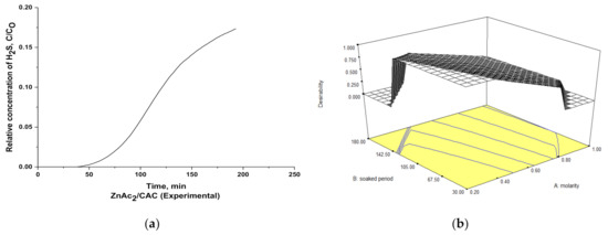 It is possible to test the effect of quadratic interactions by using a BBD combined with response surface modeling and quadratic programming. This experimental approach used the regression design to show the result as a predictive function of variables with an impartial and limited variance. In this strategy, the graphical profile illustrates the summary of the response surface being examined [45]. The effects of three preparation factors were investigated: (A) ZnAc2 solution molarity (M), (B) soaked time (min), and (C) soaked temperature (°C) on the CAC surface as well as the capture of the H2S gas. Two responses were used, namely the H2S adsorption capacity and the BET surface area, as a reference to the preparation factors.