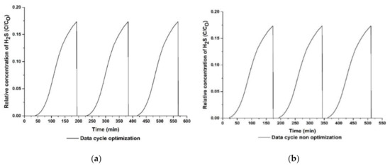 The results shown in Table 3 can be compared with those of a previous study by Zulkefli et al. [32]. On the basis of [32], the adsorption capacity and the BET surface area were obtained at 1.83 mg H2S/g and 656.75 m2/g, respectively, at 0.2 M of ZnAc2, soaked temperature of 65 °C, and soaked period of 30 min. Under similar conditions, the obtained values in this study were slightly different at 1.75 mg H2S/g and 692.65 m2/g for the adsorption capacity and the BET surface area, respectively, which was probably because of the differences in the preparation process. The decrease in the BET surface area in the adsorbent was caused by the blocking of some micropores with the chemical compound of ZnAc2. This characterization of the pore structure influenced the adsorption profiles [50,51]. In contrast, the data in Table 3 show similar trends to those reported by Nakamura et al. [52]. The BET surface area decreased with an increase in the ZnAc2 molarity, even though the BET surface area was slightly different for both cases because of the differences in the preparation conditions.