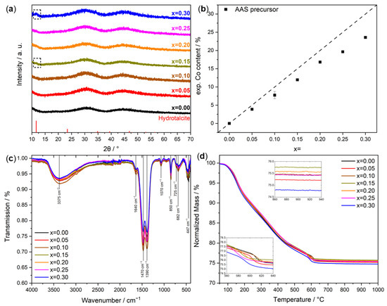 (a) XRD powder patterns of the as-prepared sample series. (b) Co contents in the samples before calcination. (c) ATR-FTIR spectra of the samples before calcination. (d) Thermogravimetry mass losses.