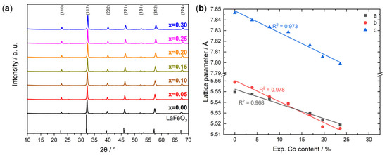 After thermal decomposition of the amorphous precursors during calcination at 800 °C, XRD powder patterns were recorded. The corresponding diffractograms, shown in Figure 3a, are compared to orthorhombic LaFeO3 (ICSD: 93611 [41]) with indications of the most intensive (hkl) assignments. The patterns can be fully described by the one calculated for the perovskite structure, which further confirms the absence of secondary crystalline phases. The reflections are shifted to higher angles with increasing Co content, which is indicative of the incorporation of Co into the crystal structure. This is related to replacing Fe accompanied by a decrease of the d-spacing associated with the smaller effective ionic radius of low-spin Co3+ (0.545 Å) compared to Fe3+ (0.645 Å) in the high-spin configuration [42], which in the latter case is the ground state electronic structure of octahedrally coordinated trivalent Fe cations in LaFeO3 [43]. The formation of phase-pure perovskites from non-phase-pure materials is known, which is relevant to consider in view of the hydrotalcite-like by-phase encountered for higher Co contents in the precursor stage. For example, the formation of phase-pure LaFeO3 was reported as well from Fe2O3 and La2(CO3)2(OH)2 [25]. As the homogeneity of the amorphous precursor is unknown, and a hydrotalcite-like by-phase was observed in some samples, perovskite formation from a multi-phase precursor system must also be assumed for our synthesis approach.