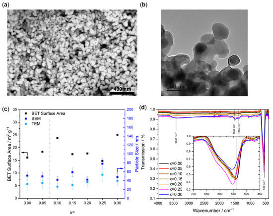 (a) SEM image of the sample with x = 0.05 after calcination. (b) TEM image of the sample with x = 0.05 after calcination. (c) BET surface areas compared to the particle diameters. (d) ATR-FTIR spectra of the samples after calcination.