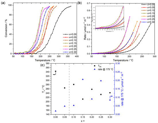 For the rate comparison at 175 °C Figure 5c, a general trend towards higher activity can be observed as a function of the Co content with the exceptions of x = 0.15 and x = 0.25, which show extraordinarily high activities.