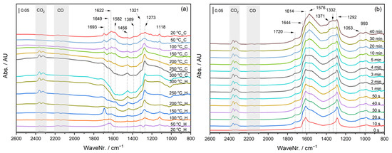 DRIFTS was performed using an FTIR spectrometer from ThermoFisher Scientific (Waltham, MA, USA), i.e., Nicolet™ iS20, equipped with a DRIFTS cell (Praying Mantis™, Harrick Scientific Products Inc., Pleasantville, New York, USA) and a Mercury Cadmium Telluride detector (MCT) cooled with liquid nitrogen. The DRIFTS cell outlet gas stream was analyzed continuously during the experiment by an on-line mass spectrometer (Omnistar GSD 320, Pfeiffer Vacuum, Wetzlar, Germany). Using a four-port selector valve, the inlet gas was switched between two different streams, one for He-purging and/or pretreatments (He or 20% v/v O2 in He) and the other containing the probe gas (0.2% v/v CO in He or the reaction mixture of 0.2% v/v CO, 2% v/v O2 balanced in He). A flow-through configuration was applied in all segments with a total flowrate of 80 mLn min−1. At first, the loaded samples (~30–40 mg fine powder) were pretreated by He at 150 °C for 1 h (at a heating rate of 10 °C/min), after which the cell was cooled down to 20 °C at the same rate. After stabilizing the temperature, the background spectrum was collected in He. Then, the samples were exposed to the reaction mixture while ramping the temperature to 300 °C at a rate of 10 °C/min and collecting the spectra every 1 min (corresponding to 10 °C intervals). The samples were dwelled for 10 min at 300 °C and subsequently cooled down to 20 °C at the same rate while collecting spectra every 1 min. In the second part of the experiment, the samples were pretreated in 20% O2 for 1 h at 350 °C to clean the surface from the formed carbonate species and then cooled down to 200 °C. After stabilizing the temperature, the gas was changed to He, and the system was purged for 10 min to collect the new background. Subsequently, the catalysts were exposed to the reaction mixture for 40 min while collecting the spectra every 10 s. The first spectrum was collected before switching the gas, so it represents the time 0. In the final part of the experiment, the catalysts were pretreated in 20% O2 again at similar conditions stated above and then cooled down to 10 °C. After temperature stabilization and collecting a new He background, the samples were exposed to 0.2% CO probe gas for 40 min, and the spectra were collected every 10 s.