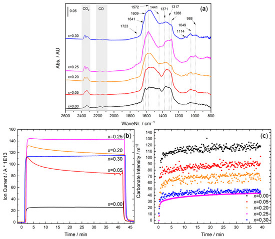 To further analyze the stability of the catalyst surface under steady-state conditions, the samples were studied after an oxidative treatment for 40 min at 200 °C upon exposure to the reaction mixture. The resulting spectra are shown in Figure 6b for x = 0.25 and for other samples in Figure S19a–d. Evidently, there was a progressive formation and build-up of carbonate-based species as soon as the catalysts were exposed to the reaction mixture. Two simultaneous pathways can be considered to form carbonates on these catalysts. One would be the result of reducing the 3+ cations at the surface by CO, especially known for Co3+ when O2 is not present, which may result in the direct formation of carbonates on the surface [56]. Simultaneously, if the catalyst has some CO oxidation activity, the produced CO2 molecules can be adsorbed on the surface and subsequently form carbonates, especially if the surface has weak Lewis basic sites, as reported for example for Al2O3 and Mg2SiO2 [33,57]. Depending on the conditions of the experiment, one or the other could be dominant, but neither could be ruled out. In the case of the herein studied perovskite catalysts, it is reasonable to assume that the formation of carbonate is mainly due to the surface reaction of CO with the two active O−, as reported for Co3O4 catalysts [58]. The positive correlation of the extent of the reaction with the Co content can be qualitatively inferred by the gas phase CO and CO2 intensities. Like the transient test, similar bands are observed in the steady-state, some of which are promoted or suppressed over time. To better compare this, the DRIFTS spectra at 40 min are depicted in Figure 7a. Here, the band at 1728 cm−1, possibly related to C=O in bidentate coordination, is promoted by the Co content. The same is observed for bands at 1641, 1572, 1288 cm−1, while the band at 1439 cm−1 seems to be suppressed. The spectra were also compared in the upper range of the wavenumber, which showed a very weak yet similar interaction of CO2 with the hydroxyl group at 3633 cm−1 (see Figure S20) [59]. The similarity of the band intensity and position among the samples would suggest that the possible contribution of the OH groups of the catalyst in the CO oxidation activity was most likely insignificant and not responsible for the observed activity trend. Nevertheless, it is similar among the samples showing the same activity, particularly among x = 0.20 and 0.30, which suggest a similar surface structure for these samples despite different Co contents. The CO2 formation normalized by He intensity, sample mass, and BET surface area monitored using MS (see Figure 7b) indicated a significant promoting effect of Co. Interestingly, the deactivation of the catalysts, as indicated by a gradual decline of the CO2 signal, was suppressed at the higher Co contents. In other words, the more Co in the sample, the less significant deactivation could be observed, in line with the observations during the transient DRIFTS measurements and during the kinetic steady-state measurements of the catalysts x = 0.25 and x = 0.00 at 200 °C (Figure S17c). This could be backed up by analyzing the DRIFTS spectra in the carbonate region, i.e., in the wavenumber range of 1150–1700 cm−1. To this aim, the spectra were integrated within the specified range during the whole isothermal segment and normalized based on the BET surface area. As depicted in Figure 7c, the carbonates were formed as soon as the catalysts were exposed to the reaction mixture but their build-up was suppressed by the higher Co content in the sample. The trend between the activity observed from the transient catalytic experiments and the carbonate build-up during the transient and isothermal DRIFTS measurements were consistent (i.e., x = 0.25 > x = 0.30, x = 0.20 > x = 0.05 > 0.00). This is also in line with most of the normalized CO2 formation MS signals, with the x = 0.05 being an outlier by showing a sharp CO2 signal at the beginning, which is then diminished later on by time on stream. The inverse correlation between CO2 and carbonate formation could indicate the blocking of active sites due to a larger amount of carbonate species preferentially formed by increasing the Fe content. On the other hand, one could hypothesize that the Co incorporation enhances the decomposition of the carbonates, which are formed as reaction intermediates rather than surface poisoning species.