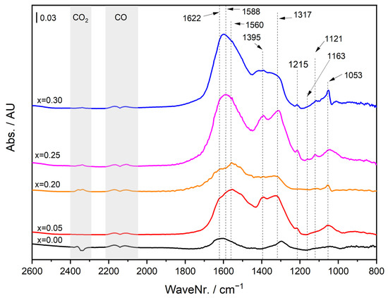 The CO probe gas interaction with the adsorption sites was additionally investigated at 10 °C, and the results during 40 min of exposure are plotted in Figure S21. As the extent of the reaction is limited at this temperature, the formation and build-up of carbonates can be attributed more dominantly to the reduction of the 3+ cations. However, the contribution of CO2 adsorption, whether as the product of the reaction or impurity of the CO mixture, cannot be totally excluded. Indeed, there is a positive correlation between the Co content and the build-up of the carbonates (inferred by the relative intensities of gas-phase CO and the carbonates), which is consistent with the reduction of Co3+ by CO. Additionally, our previous hypothesis in the discussion about the steady-state data can be supported in the sense that Co3+ promotes the formation of the carbonates. However, it also enhances their decomposition in an O2-rich environment. The Co-free sample shows a similar behavior, although with much lower intensities. The 40 min spectra of the catalyst are stacked in Figure 8 for better comparison. Several bands can be observed in the range of 1620 to 1053 cm−1, while others show different relative intensities. For instance, there is a positive correlation between the relative intensities of the bands at 1620, 1396, and 1121 cm−1. In summary, Co content has a positive effect on the formation of the carbonates in an O2-free environment, consistent with the higher population of reducible surface Co3+ species. On the other hand, when the atmosphere is O2-rich, the adsorption of CO is enhanced by the incorporation of Co, leading to the formation of carbonates as reaction intermediates, but their decomposition is also promoted by Co. In the end, this leads to a more active catalyst in CO oxidation, which is yet more resistant to surface poisoning. The small changes in the type of carbonates in all DRIFTS experiments could reflect minor differences in the surface properties, which could have an impact on the reaction pathway and the overall catalytic activity. The similarity of the surface properties among those samples with a comparable morphology, especially x = 0.20 and 0.30, is also consistent with the similar observed activity trend.