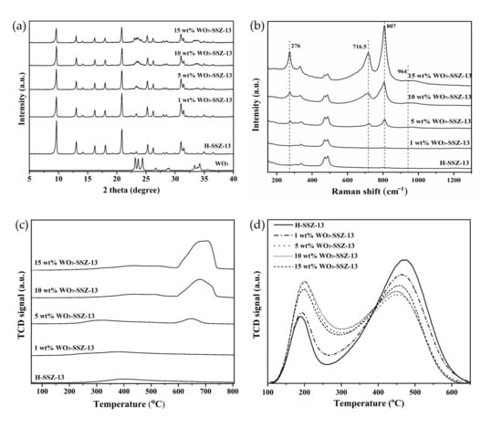 To obtain further information on the WO3 particles in the SSZ-13 crystal, Raman spectra and H2-TPR profiles of all samples were collected and the results are shown in Figure 1b,c, respectively. The Raman spectra depict that the aggregated WO3 species, including the amorphous and crystalline phase, continuously increase with an increase of the WO3 loading from the 5 wt% WO3-SSZ-13 sample, as reflected by stronger bands at 276, 716, and 807 cm−1. These bands were respectively assigned to the deformation vibration mode of W–O–W, the bending vibration mode of W–O, and the symmetric stretching vibration mode of W–O. The broad band at 964 cm−1 was assigned to the symmetric stretching vibration mode of O=W=O of isolated surface tetrahedral WO3 species [21]. From the H2-TPR analysis, a peak corresponding to the reduction of WO3 species appeared at 640 °C in the 5 wt% loaded sample. The peak intensity became higher and the center of the peak shifted to a higher temperature as the WO3 loading increased. Both the Raman and H2-TPR analyses confirmed that the aggregation of WO3 started after 5 wt% loading.