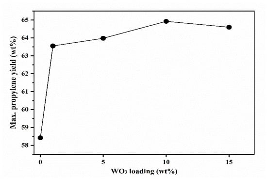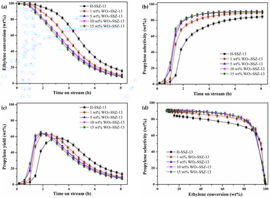 The ETP catalytic reaction results are presented in Figure 2. As shown in Figure 2a, the ethylene conversion dropped with increasing time-on-stream. After loading WO3 on the SSZ-13 zeolite, the decrease of ethylene conversion was dramatically faster with more WO3 loading up to 5 wt%, and then the conversion showed a very gentle downward trend with further 10 wt% and 15 wt% loading. From the thermogravimetric analysis (TGA) and the gas chromatography-mass spectrometry (GC-MS) analysis of coke extracts for the spent samples with different reaction times (data are not shown), the deactivation of the WO3-SSZ-13 catalyst was due to the blockage of the zeolite pores and acid sites by the formation of large coke species [2]. In a reverse manner, the propylene selectivity showed the opposite tendency to the conversion trend (Figure 2b). All WO3-modified samples showed considerably higher propylene selectivity compared to the parent H-SSZ-13 catalyst. The time-on-stream where the propylene starts forming after the induction period (1.5 h in the case of H-SSZ-13) was shortened with loading WO3. From this observation, it is anticipated that the role of tungsten might be attributable to the diffusion restriction of hydrocarbons inside the cages of crystals, which takes place in the induction period according to the ETP reaction mechanism [2]. The highest value of maximum propylene yield (64.9 wt%) was obtained by the 10 wt% WO3-SSZ-13 sample (Figure 2c). The 15 wt% WO3-SSZ-13 sample showed excellent performance with regard to propylene selectivity, but due to the comparatively reduced conversion, it showed lower propylene yield than the 10 wt% WO3-SSZ-13 sample. Increased propylene yield with time-on-stream occurred with WO3 loading can be ascribed to the decreased strong acid sites. As seen in Figure 2d, the 10 wt% WO3-SSZ-13 exhibited the highest ethylene selectivity at the same ethylene conversion among all samples. Therefore, it is concluded that an optimum loading amount of WO3 was 10 wt% for the highly selective ETP reaction. Figure 3 shows the correlation between WO3 loading and ETP reactivity in terms of propylene yield and selectivity. It is noteworthy that even a small amount of WO3 loading (1 wt%) led to a noticeable change in propylene selectivity and yield.