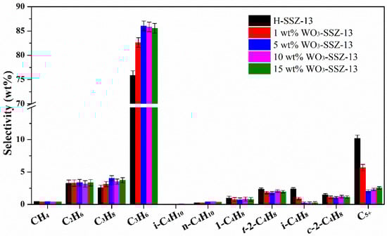 The supported tungsten oxide catalysts have been widely studied due to their excellent performance in producing propylene by the olefin metathesis reaction [18,19]. Considering the tungsten oxide effect, it is anticipated that additional propylene formation will be possible over the reaction between 2-butenes as side products and unreacted ethylene by loading tungsten oxide on the SSZ-13 zeolite in the ETP reaction. In this study, for the first time, we explored the possibility of enhancing the propylene yield by suppressing the undesired products over the tungsten oxide-modified SSZ-13 (WO3-SSZ-13) catalyst during the ETP reaction.