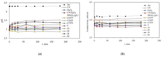 Figure 1a,b shows the behavior of pH and electric conductivity for control systems (air, UV, H2O2, and UV/H2O2) and photo-Fenton like reactions at different catalyst concentrations. In general, there was no variation in pH and electrical conductivity values throughout time. Only a slight increase in pH (<0.5) appeared in experiments with higher amounts of catalyst, specifically, in those where the concentration of HFeO2 was above 10 g/L. Because not all reactions taking place during the oxidation time are known exactly, it is possible that some compounds of basic character are produced in the medium due to incomplete degradation of the organic matter (Equation (1)).