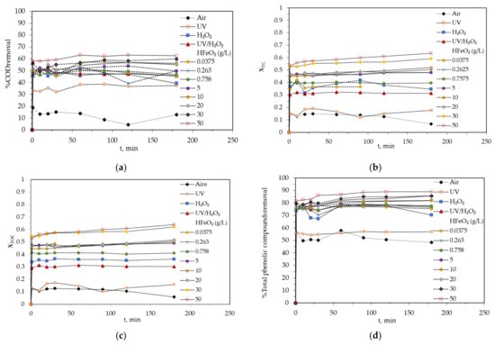 Figure 2d shows that it is possible to degrade the included phenolic compounds, %TOCs removal, of OMW with all oxidation systems evaluated; air and UV appeared to be the least powerful oxidation treatments. In contrast, the photo-Fenton system with 50 g/L catalyst degraded about 90% of the total phenolic content in the samples. In general, when the HFeO2 concentration was increased, the %TPCs removal was also slightly increased. However, it can be seen that even for air and UV systems, TPCs removal was equal to 52.3 ± 3.53% and 56.7 ± 0.542%, respectively. The H2O2 system registered %TPCsremoval = 75.0 ± 3.05%, and the UV/H2O2 system provided a slightly higher value equal to 76.8 ± 1.73%. This fact indicates the susceptibility of phenolic compounds to be oxidized, which gives them a perfect buffering capacity of oxidation of other important compounds such as lipids, proteins, vitamins, dyes, carbohydrates, and pigments of the food industry [33]. The majority of phenolic compounds (5% of organic matter) are transferred to wastewater in olive oil production [34] and eliminated (75–80%) in a short period of time (few minutes, Figure 2d). Evidently, this treatment is more efficient for the degradation of phenolic compounds than for COD, despite the fact that both reflect the organic matter content. This advantage in the degradation of phenolic compounds could be due to the fact that these molecules are found in simpler forms and are therefore easier to attack, while COD may involve molecules with high molecular weight such as lignin and cellulose, among others [35].